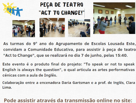 No dia 7 de junho realizou-se a peça de teatro “Act to Change”, no âmbito do projeto “To speak or not to speak English that is always the question”, o qual incluiu 5 turmas do 9º ano do agrupamento, com a colaboração da encenadora Daria Gartsman. Pode visualizar Fotos da peça de teatro (aqui), ou […]