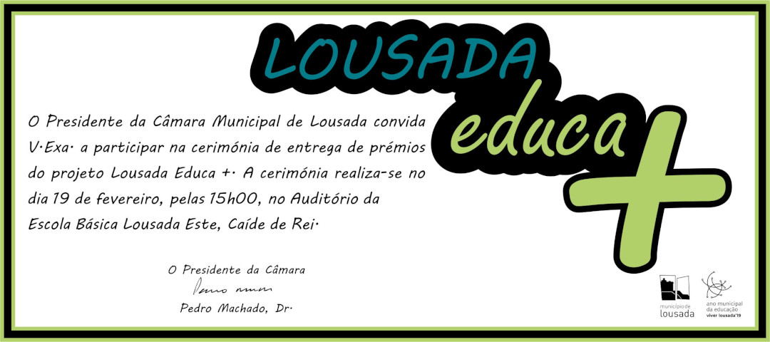 Concluído que está o processo de apuramento de projetos ao Lousada Educa +, relativo ao ano letivo 2018/2019, endereçamos o convite para a cerimónia de entrega dos prémios aos projetos vencedores, a ter lugar no dia 19 de fevereiro, às 15h00 na Escola Básica de Lousada Este, Caíde de Rei.