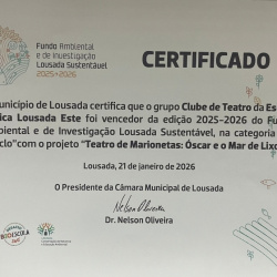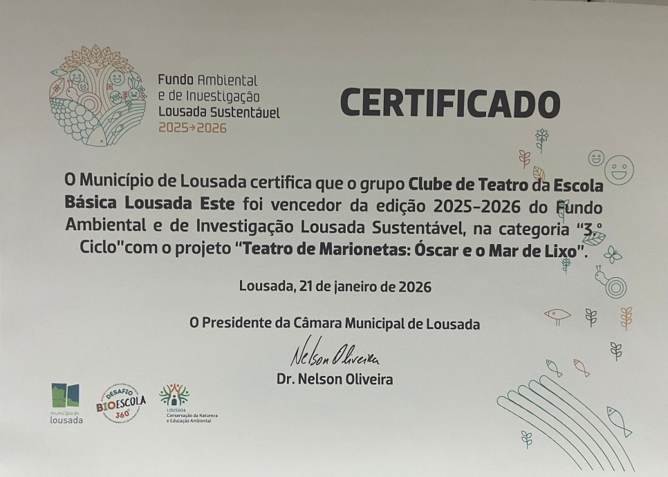 “O Clube de Teatro da Escola Básica Lousada Este foi vencedor da edição 2025/2026 do Fundo Ambiental e de Investigação Lousada Sustentável, na categoria “3.º ciclo”, com o projeto Teatro de Marionetas intitulado “Óscar e o Mar de Lixo”, baseado na história do livro da autora Nádia Eusébio (Doutorada em Biologia).